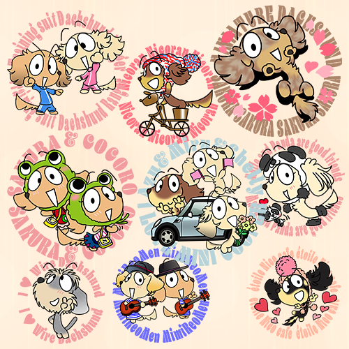 ダックスステッカーの正面向きバージョンは、ロング、スムース、ワイヤーそれぞれの毛種を網羅し、合わせて60種類以上の毛色パターンをご用意しています!